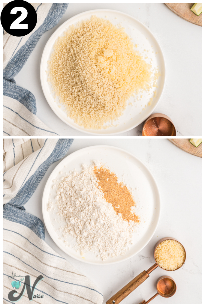 - Place one cup of flour mixed with garlic powder on a small plate or bowl.